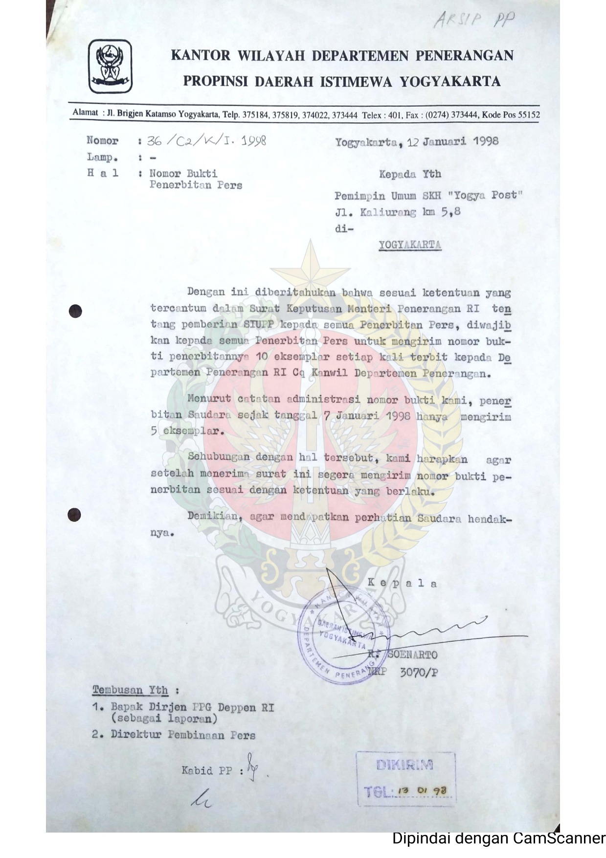 Surat dari Kepala Kantor Wilayah Departemen Peneranga Daerah Istimewa Yogyakarta kepada Pemimpin Surat Kabar Harian Yogya Post Yogyakarta perihal kewajiban kepada semua penerbit pers untuk mengirim nomor bukti penerbitannya 10 eksemplar setiap kali terbit dan menurut catatan administrasi nomor bukti sejak tanggal 7 Januari 1998 hanya 5 eksemplar.