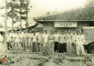 Para peserta rapat sedang foto bersama di depan gedung Djawatan Perbu-ruhan DIJ di Jalan Malioboro No. 64.