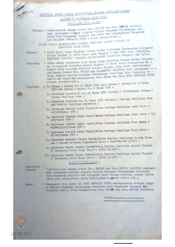 Keputusan Bupati Kepala Daerah/ Ketua Pemilihan Daerah Tingkat II Kabupaten Kulon Progo No.11/PPD II/1981 tentang pemberhentian dengan hormat sdr. Fauzan dan sdr. Sofyan Bachtiar dari jabatannya sebagai anggota Panwalakcam Pengasih dan Galur dan pengangkatan sdr. Dawam dan Sdr. Imam Busyoiri Yunus sebagai penggantinya.