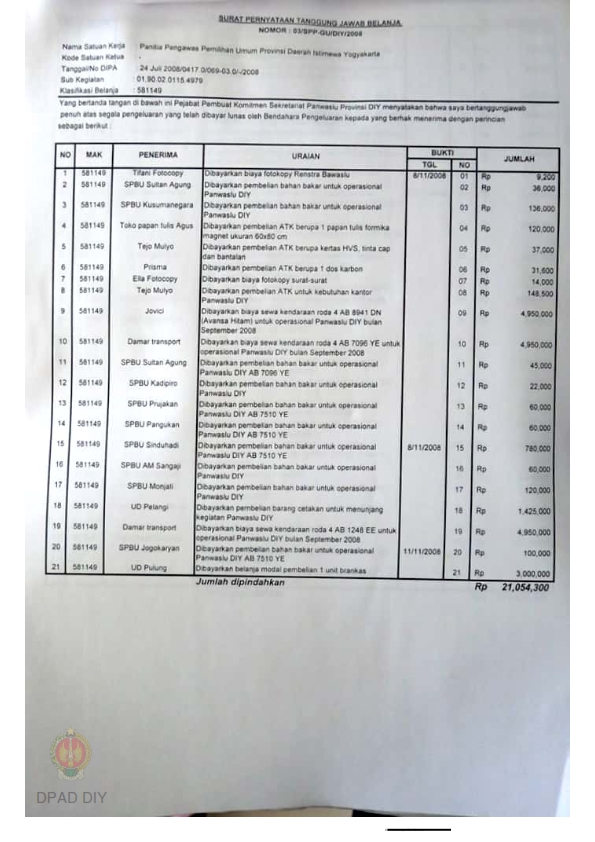 Surat Pernyataan Tanggungjawab Belanja Panwaslu Propinsi DIY tentang Penyelenggaraan Kegiatan Pendukung Pemilu Tahun 2009