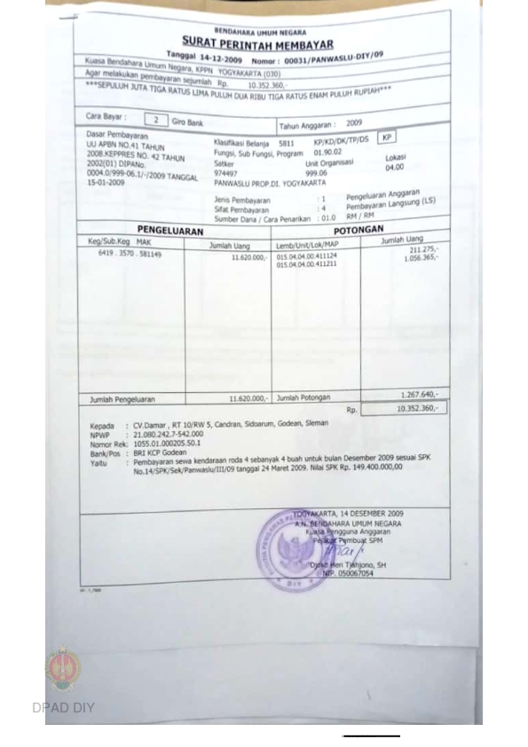 Surat Perintah Membayar No 00031/PANWASLU-DIY/09 sejumlah Rp 10.352.360 untuk pembayaran sewa kendaraan roda 4 sebanyak 4 buah pada Bulan Desember 2009 sesuai SPK No 14/SPK/Sek/Panwaslu/III/09 tanggal 24 Maret 2009.