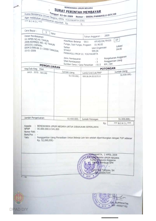 Surat Perintah Membayar No. 00006/PANWASLU-DIY/09 sejumlah Rp 51.930.000 untuk penggantian uang persediaan belanja lain-lain.