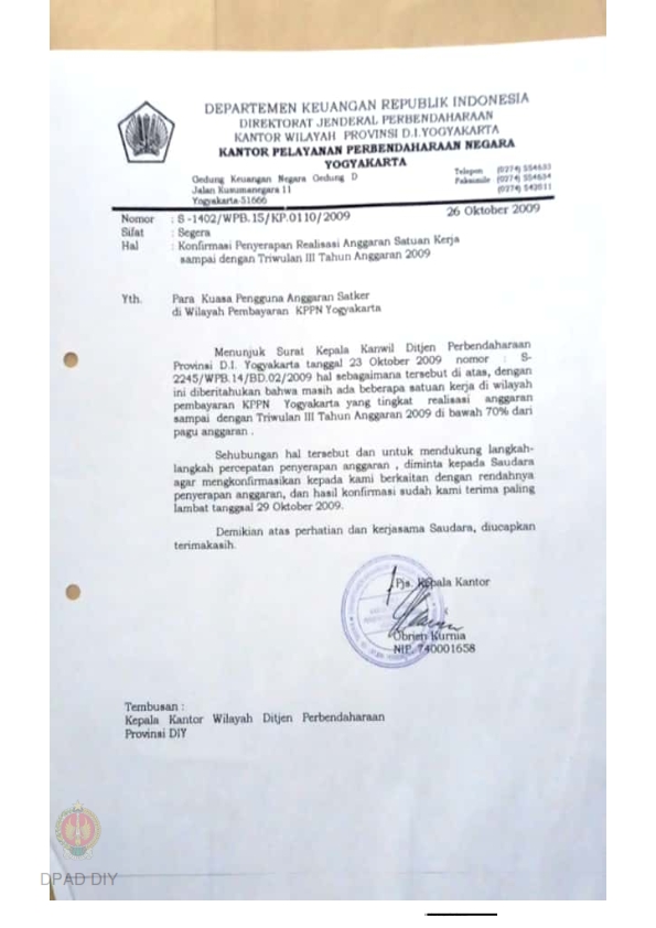 Surat Departemen Keuangan No 5-1402/WPB.15/KP.0110/2009 tentang Konfirmasi Penyerapan Realisasi Anggaran Satuan Kerja sampai dengan Triwulan III Tahun 2009.