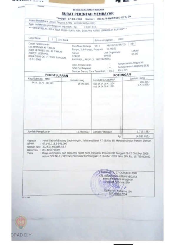 Surat Perintah Membayar No 00027/PANWASLU-DIY/09 sejumlah Rp 14.031.815 untuk membayar akomodasi dan konsumsi Raker pengawasan Pemilu Propinsi DIY tanggal 21 s.d 22 Oktober 2009 sesuai SPK No 11/SPK/Sek.Panwaslu/X/09 tanggal 17 Oktober 2009.
