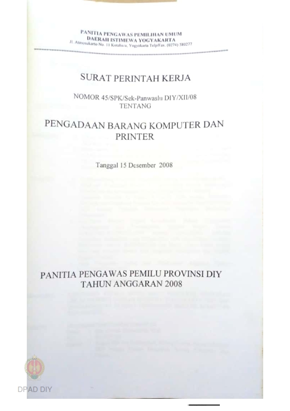 Surat Perintah Kerja No 45/SPK/Sek.Panwaslu DIY/XII/08 tentang Pengadaan Barang Komputer dan Printer
