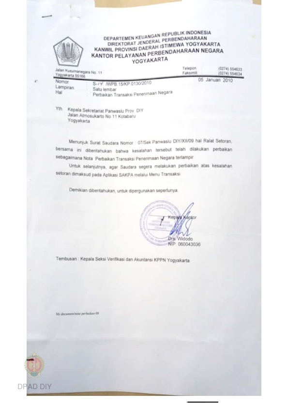 Surat No S-14/WPB.15/KP.0130/2010 tentang Perbaikan Transaksi Penerimaan Negara.