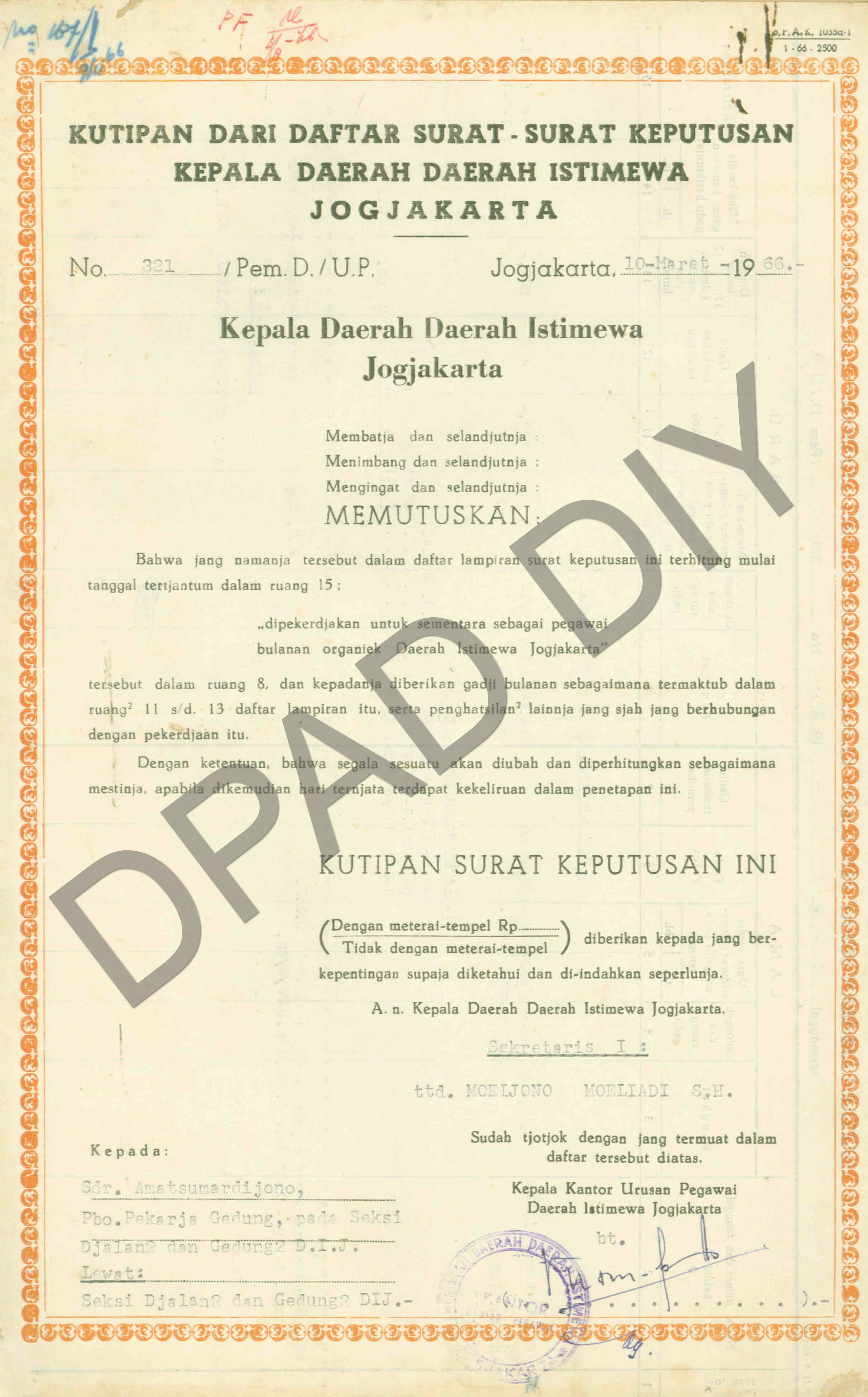 Kutipan Surat Keputusan Kepala Daerah DIY tentang pengangkatan sementara sebagai pegawai bulanan organic DIY Sdr. Harjowasito dkk