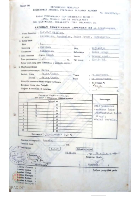 Laporan dari Balai Pengawasan dan Sertifikasi Benih II I Jateng dan DIY tentang pemeriksaan lapangan ke II (Pembungaan), Varitas Krueng Aceh, bulan Maret 1983 di desa Wijimulyo, Nanggulan, Kulonprogo