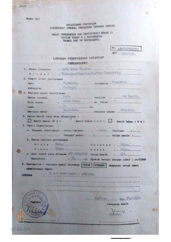 Laporan dari Balai Pengawasan dan Sertifikasi Benih II Satuan Tugas DIY tentang Hasil Pemeriksaan Lapangan Pendahuluan untuk Sertifikasi Bibit Varietas Way Seputih di BB/BP Kebun Wijilan.