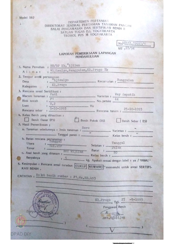 Laporan dari Balai Pengawasan dan Sertifikasi Benih II Satuan Tugas DIY tentang Hasil Pemeriksaan Lapangan Pendahuluan untuk Sertifikasi Bibit Varietas Way Seputih di BB/BP Kebun Wijilan.