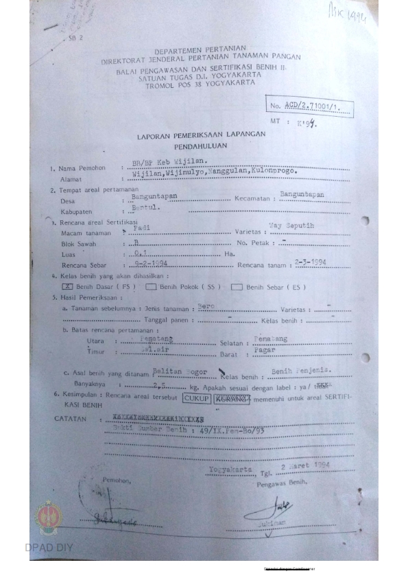 Laporan dari Balai Pengawasan dan Sertifikasi Benih II Satuan Tugas DIY tentang Hasil Pemeriksaan Lapangan Pendahuluan untuk Sertifikasi Bibit Varietas Way Seputih di BB/BP Kebun Wijilan.