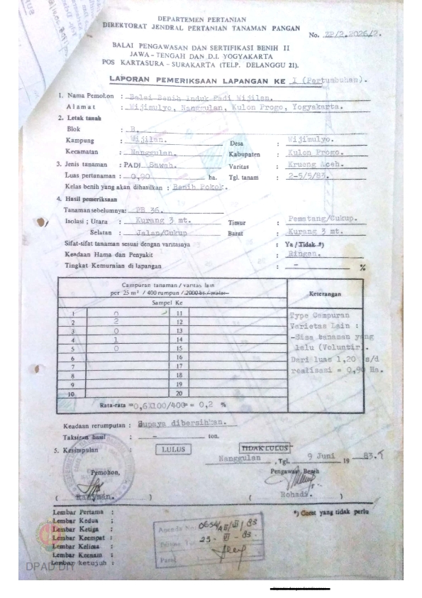 Laporan dari Balai Pengawasan dan Sertifikasi Benih II tentang hasil pemeriksaan lapangan ke I (pertumbuhan) benih varietas Krueng Aceh di Balai Induk Padi Wijilan, Wijimulyo, Nanggulan,Kulon Progo, bulan Juni 1983.