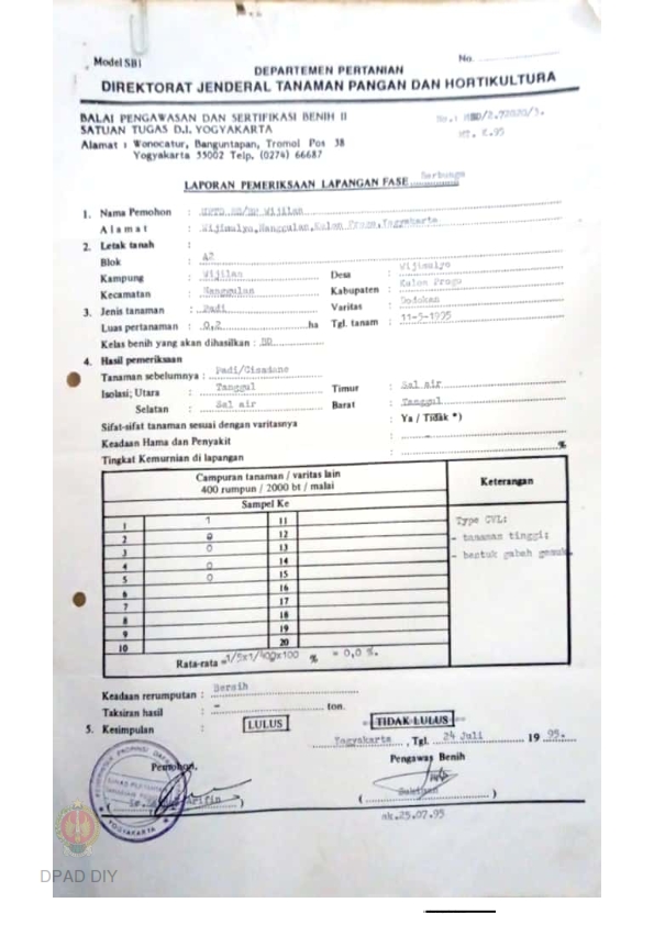 Laporan Hasil pemeriksaan lapangan fase berbunga BPSB II Jateng dan DIY jenis tanaman padi Varitas Dodokan bulan Juli 1995 di desa Wijimulyo