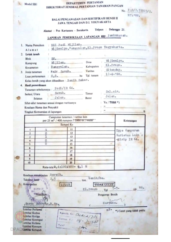 Laporan hasil pemeriksaan lapangan fase pembungaan BPSB II Jateng dan DIY jenis tanaman padi sawah Varitas Citandung bulan Juli 1988 di desa Wijimulyo Nanggulan Kulonprogo