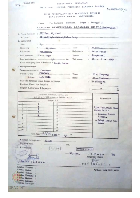 Laporan hasil pemeriksaan lapangan II BPSB II Jateng dan DIY jenis tanaman padi GOGO sawah Varitas Singkarak bulan Juli 1985 di desa Wijimulyo