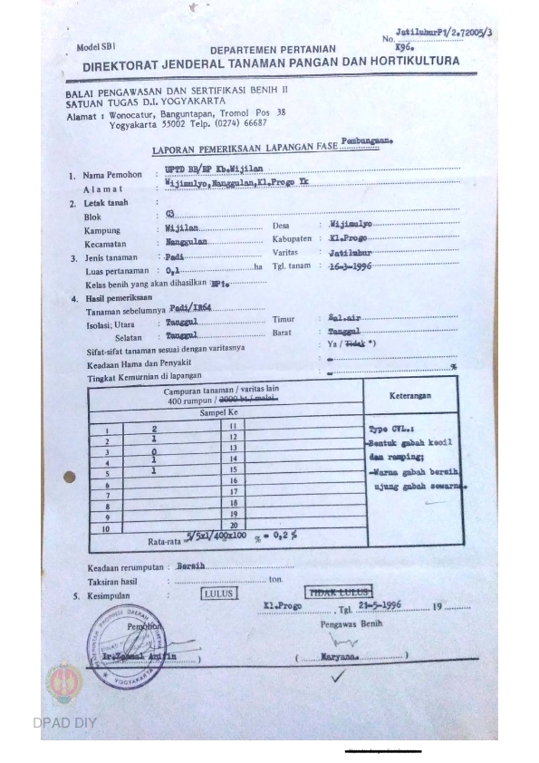 Laporan dari Balai Pengawasan dan Sertifikasi Benih Tanaman Pangan dan Hortikultura II Satuan Tugas DIY tentang hasil pemeriksaan lapangan fase pertumbuhan benih varitas Jatiluhur di UPTD BB/BP Kebun Wijilan.