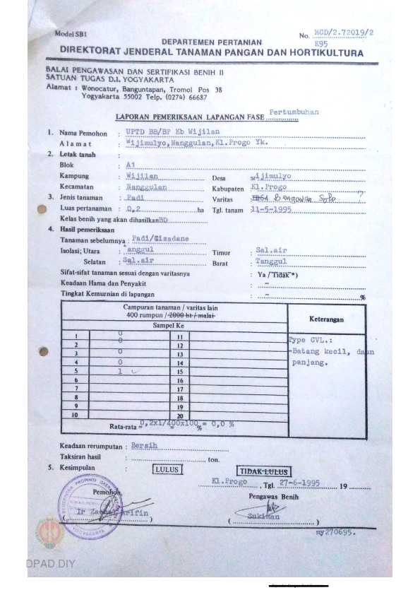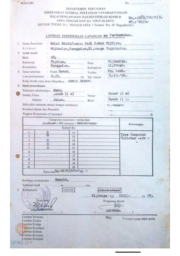 Laporan dari Balai Pengawasan dan Sertifikasi Benih II tentang hasil pemeriksaan lapangan ke I (pertumbuhan) benih varietas Sadang di Balai Benih Induk Padi Wijilan, Wijimulyo, Nanggulan, Kulon Progo.