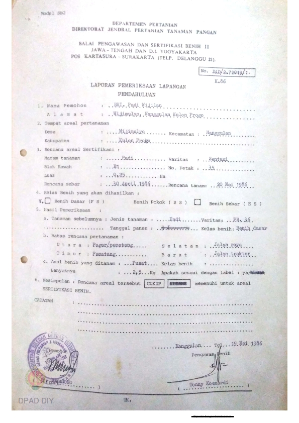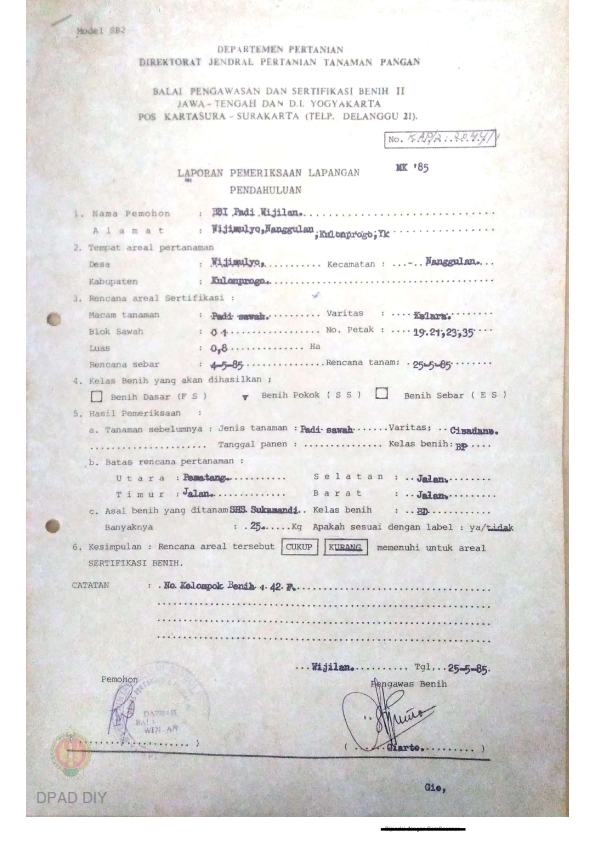 BPAD.OTDA.T21.1.13.132 Laporan dari Balai Pengawasan dan Sertifikasi Benih II Jawa Tengah dan DIY tentang Hasil Pemeriksaan Lapangan Pendahuluan untuk Sertifikasi Bibit Varietas Kulauo di BBI Padi Wijilan. Item 25 Mei Lihat