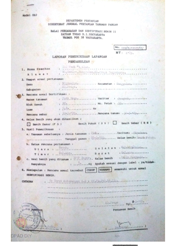 Laporan dari Balai Pengawasan dan Sertifikasi Benih II Jateng dan DIY tentang Hasil Pemeriksaan Lapangan Pendahuluan untuk Sertifikasi Benih BBI Padi Wijilan Varietas PB 36, bulan Juni 1984.
