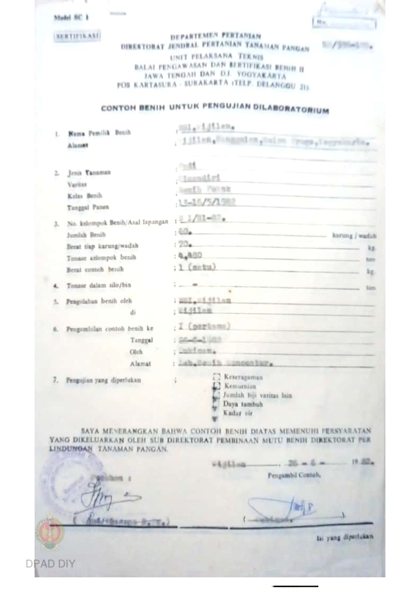 Contoh benih untuk pengujian di laboratorium BPSB II Jateng dan DIY jenis tanaman padi sawah Varitas Cimandiri bulan Juni 1982