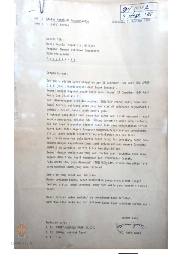 Surat dari PC. Harijawan kepada Kepala Inspektorat wilayah Prop. DIY perihal permohonan pengarahan/tindak lanjut mengenai status tanah di Maguwoharjo, Sleman.