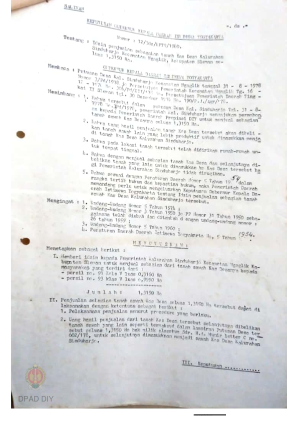 Surat Keputusan Gubernur Kepala Daerah DIY No. 12/Idz/KPTS/1980 tanggal 6 Mei 1980 tentang izin penjualan sebagian tanah kas desa Kal. Sinduharjo, Kec. Ngaglik Kab. Sleman.