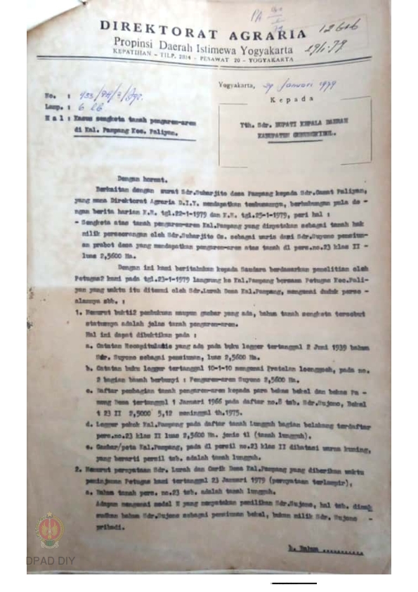 Kepala Direktorat Agraria Prop. DIY Kepada Bupati Kepala daerah Tingkat II Gunungkidul tentang Kasus sengketa tanah pengaran-aran di Kal. Pampang Kel. Paliyan.