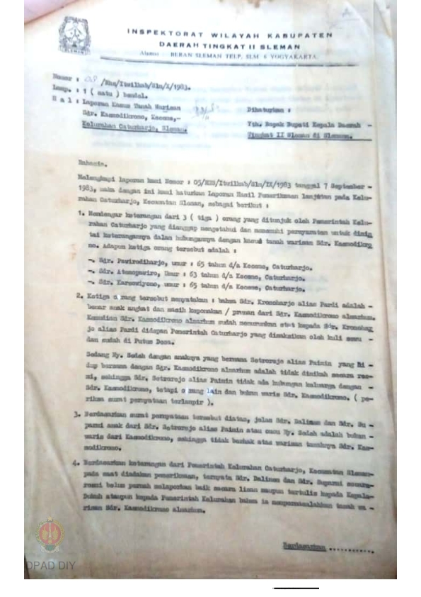 Surat Drs. Mimbar Wiyana S kepada Bupati Kepala Daerah Tingkat II Sleman tentang Laporan Kasus Tanah Warisan Sdr. Kasmodi Kromo Keceme Kal. Caturharjo, Sleman.