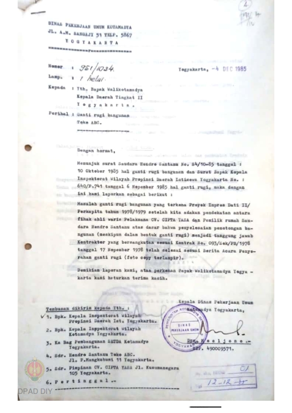 Surat dari Kadin PU Kotamadya Yogyakarta kepada Walikotamadya Yk, No. 951/1034 tanggal 4 Desember 1985 tentang ganti rugi bangunan Toko ABC, yang terkena Proyek Inpres Dati II / perkapita tahun 1978 / 1979.