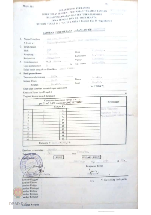 Laporan hasil pemeriksaan lapangan terakhir BPSB II Jateng dan DIY jenis tanaman padi sawah Varitas Cisadane di desa Wijimulyo Nanggulan Kulonprogo bulan Maret 1989