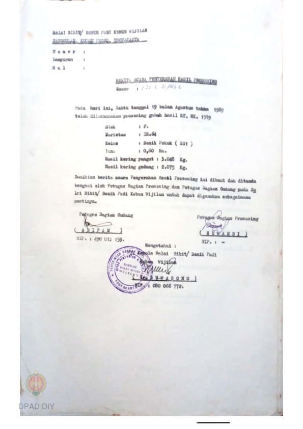 Berita acara telah dilaksanakan prosesing gabah hasil MT.MK. 1989 selama bulan Agustus 1989 dari Balai Bibit/benih padi Kebun Wijilan Nanggulan Kulonprogo