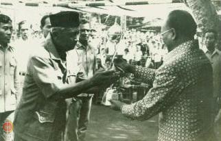 Sri Paduka Paku Alam VIII menyerahkan tropi/ piala hadiah evaluasi Desa Pancamarga di Kabupaten Sleman disaksikan para tokoh dan masyarakat.