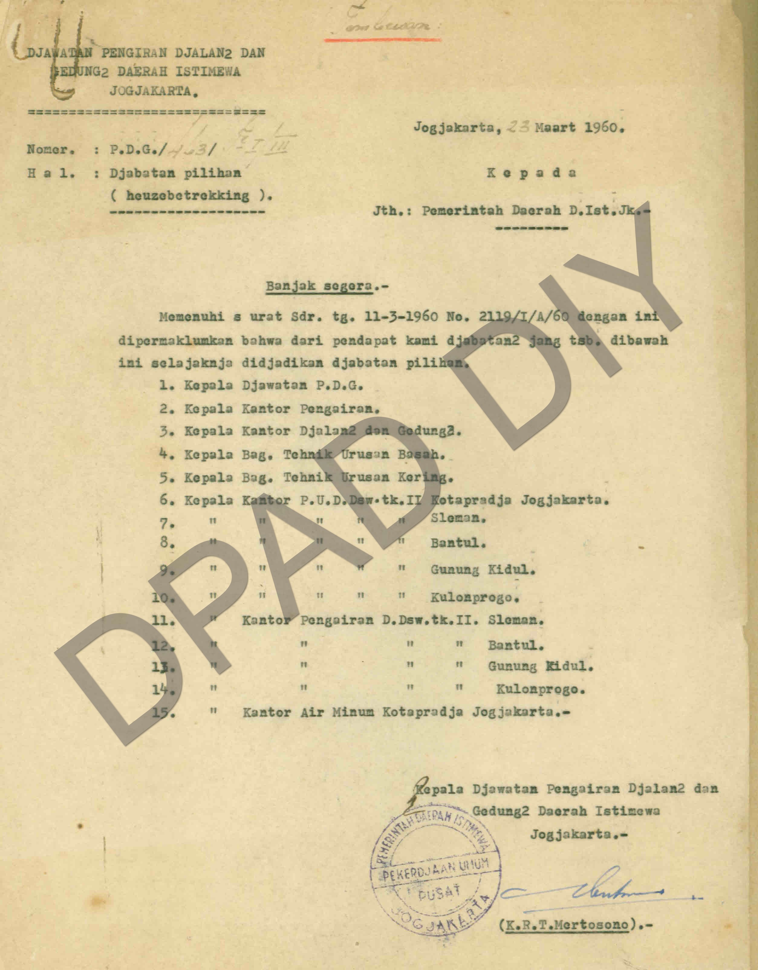 Surat dari an. Kepala Daerah DIY kepada semua Kepala Jaatan/Kantor/ Biro/Dinas di DIY perihal permohonan pendapat mengenai adanya jabatan pilihan pada Jawatan/Kantor/Biro/Dinas