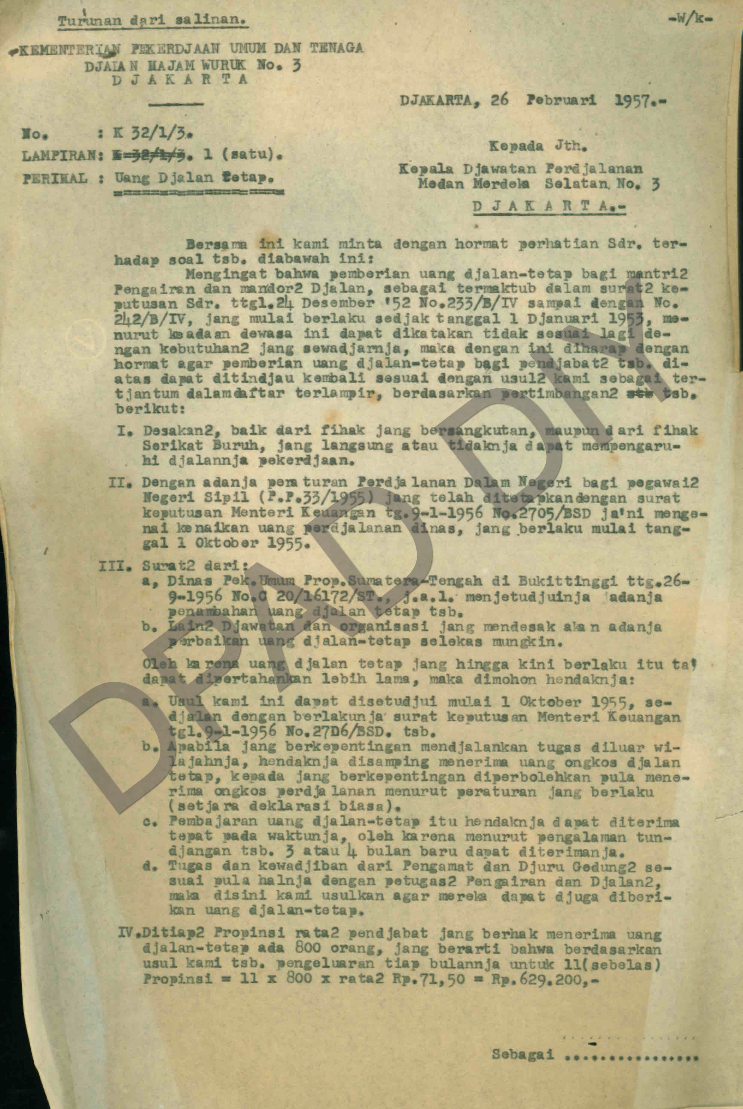 Surat dari Kementerian Pekerjaan Umum dan Tenaga di Jakarta kepada Kepala Jawatan Perjalanan Medan Merdeka Selatan No. 3 di Jakarta perihal pemberian uang jalan tetap