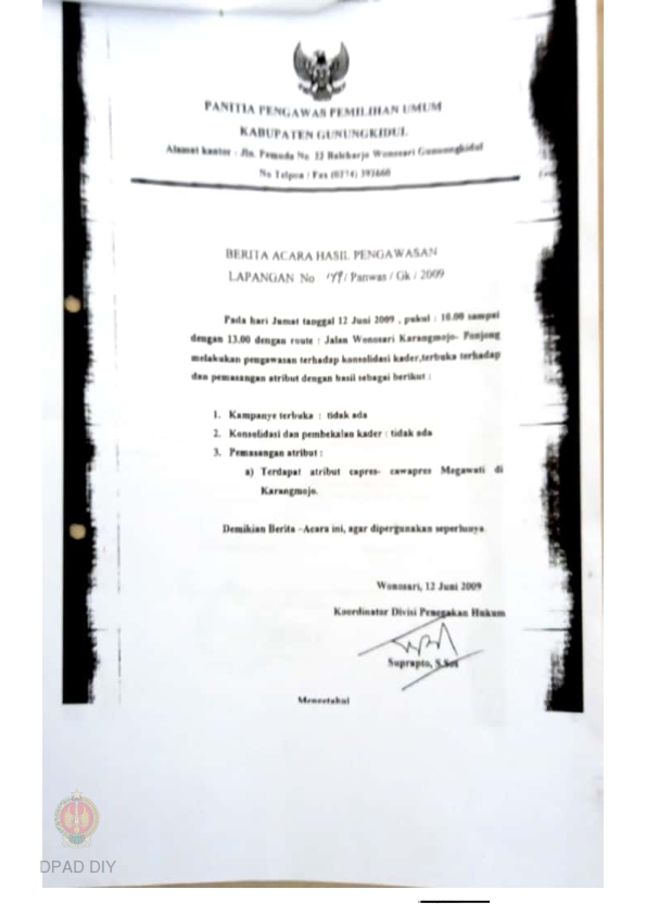 Surat dari Panwaslu Gunungkidul kepada Ketua Panwaslu Provinsi DIY perihal berita acara hasil pengawasan lapangan terhadap konsolidasi kader, kampanye terbuka dan pemasangan atribut.