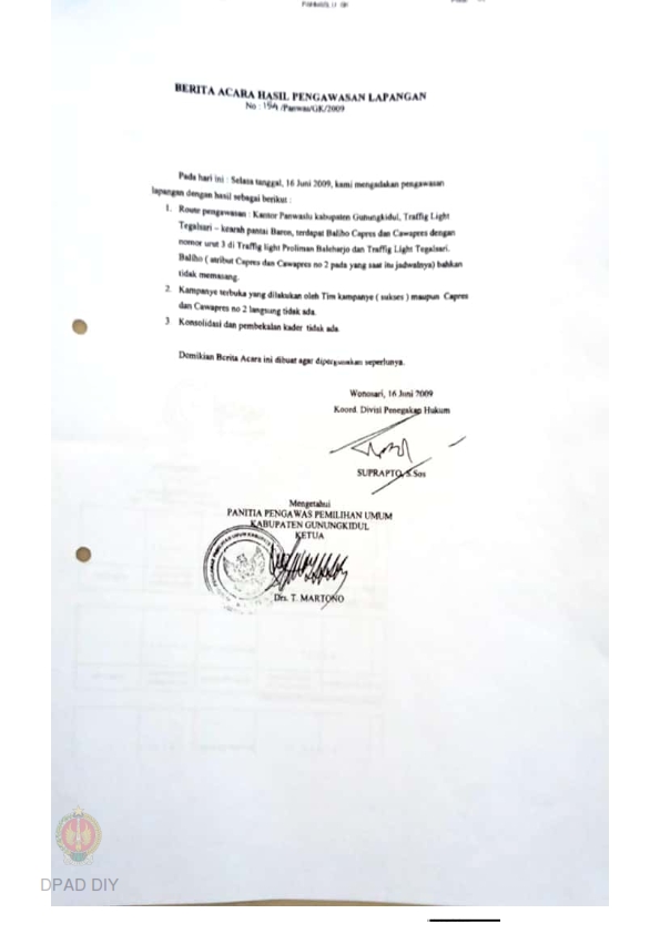 Surat dari Panwaslu Kabupaten Gunungkidul kepada Ketua Panwaslu Provinsi DIY perihal berita acara hasil pengawasan lapangan dalam rangka kampanye terbuka.