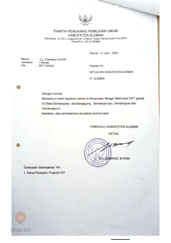 Surat dari Panwaslu Kabupaten Sleman perihal pelaporan ditemukannya DPT ganda di Desa Sendangrejo, Sendangagung, Sendangmulyo, Sendangsari dan Sendangarum.