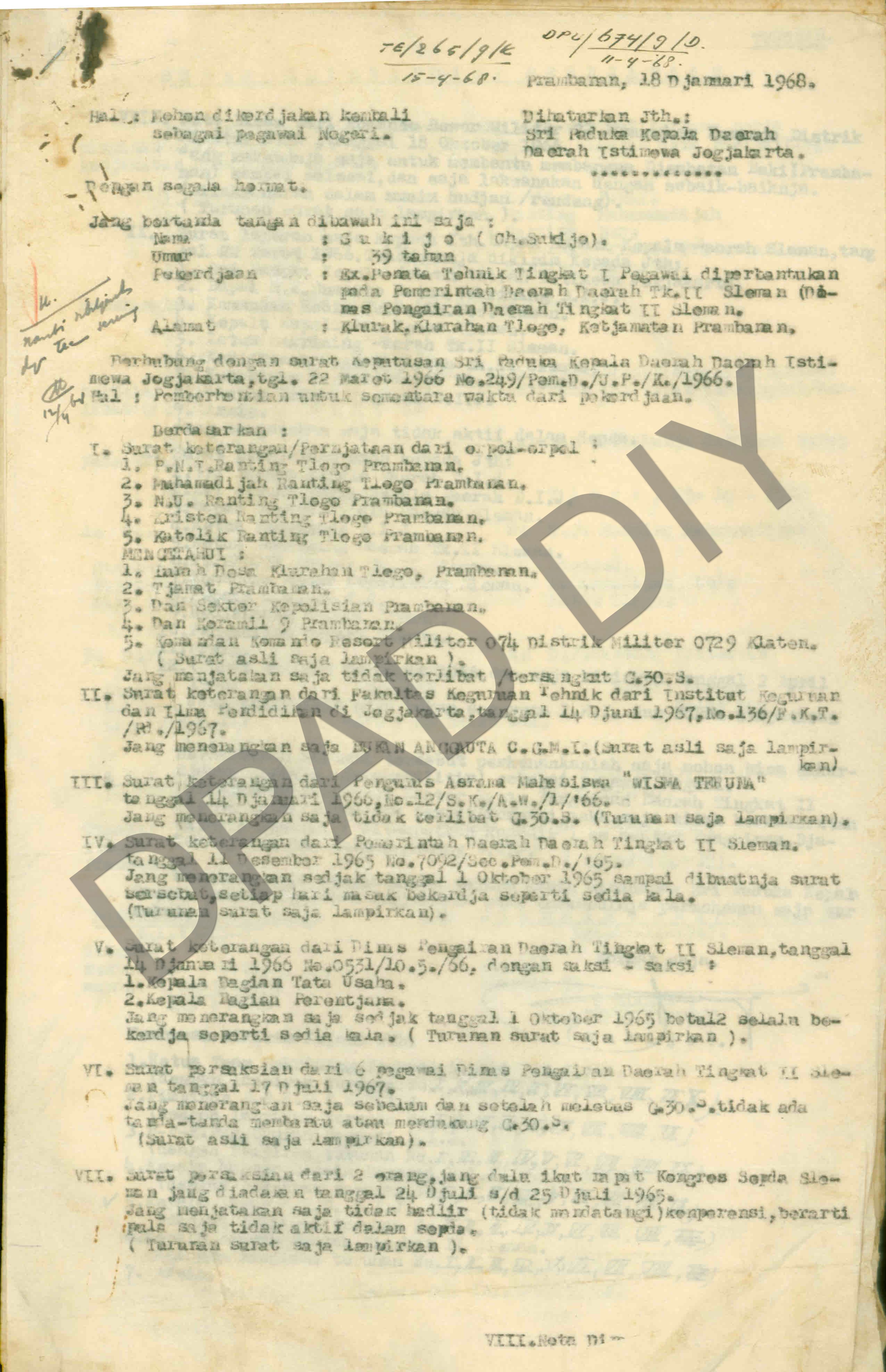 Surat dari Sukijo kepada Kepala Daerah DIY perihal permohonan bekerja kembali menjadi Pegawai Negeri Sdr. Sukijo yang diberhentikan sementara karena terlibat G. 30.S