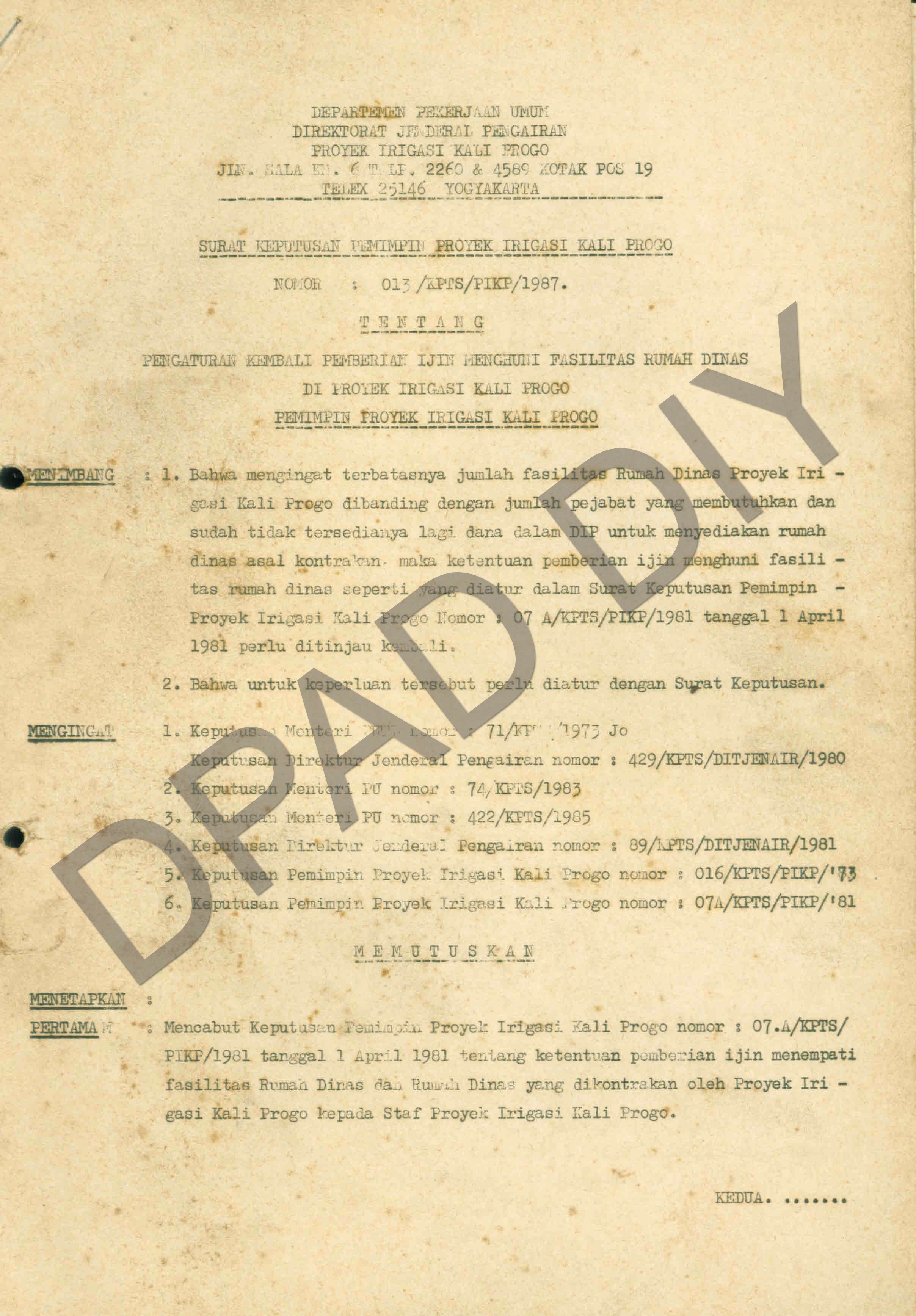 Surat Keputusan Pemimpin Proyek Irigasi Kali Progo Nomor: 013/KPTS/PIKP/1987, tentang pengaturan kembali pemberian ijin menghuni fasilitas rumah dinas di Proyek Irigasi Kali Progo