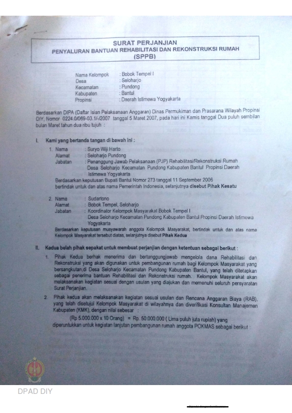 Surat Perjanjian Penyaluran Bantuan Rehabilitasi dan Rekonstruksi Rumah (SPPB), Nama Kelompok Bobok Tempel I s.d. XXI, Kel/Desa Seloharjo, Kecamatan Pundong, Kabupaten Bantul, Propinsi Daerah Istimewa Yogyakarta