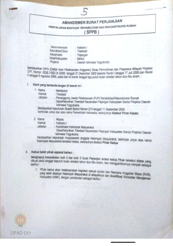 Surat Perjanjian Penyaluran Bantuan Rehabilitasi dan Rekonstruksi Rumah (SPPB), Nama Kelompok Kalisoko 01 s.d. 02, Kel/Desa TRiwidadi, Kecamatan Pajangan, Kabupaten Bantul, Propinsi Daerah Istimewa Yogyakarta