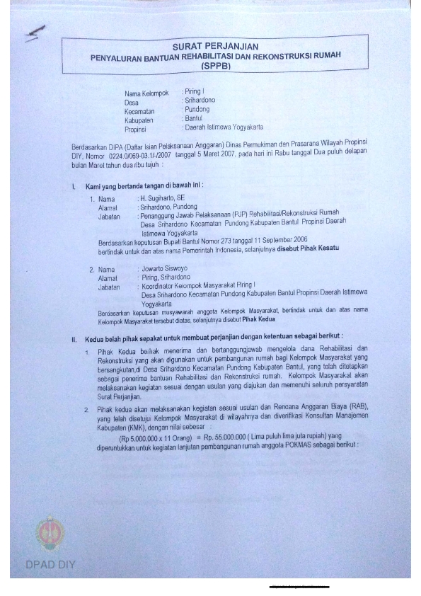 Surat Perjanjian Penyaluran Bantuan Rehabilitasi dan Rekonstruksi Rumah (SPPB), Nama Kelompok Piring I s.d. XVIII, Kel/Desa Srihardono, Kecamatan Pundong, Kabupaten Bantul, Propinsi Daerah Istimewa Yogyakarta.