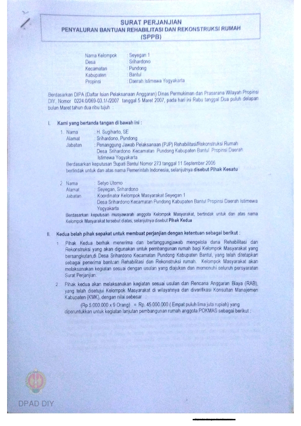 Surat Perjanjian Penyaluran Bantuan Rehabilitasi dan Rekonstruksi Rumah (SPPB), Nama Kelompok Sayegan 1 s.d. 19, Kel/Desa Srihardono, Kecamatan Pundong, Kabupaten Bantul, Propinsi Daerah Istimewa Yogyakarta.