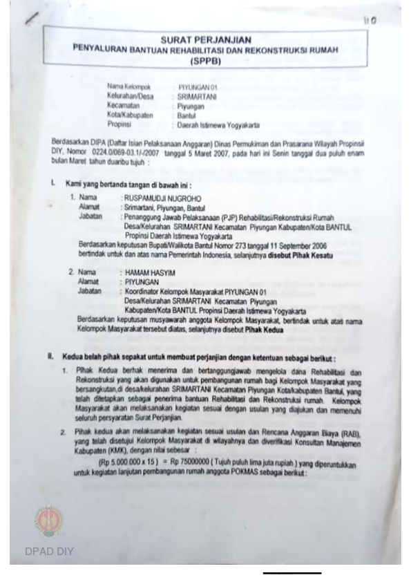 Surat Perjanjian Penyaluran Bantuan Rehabilitasi dan Rekonstruksi Rumah (SPPB), Untuk Perbaikan Rumah Rusak Berat Nama Kelompok Masyarakat Piyungan  01 s.d 19, Kel/Desa Srimartani, Kecamatan Piyungan, Kabupaten Bantul, Provinsi Daerah Istimewa Yogyakarta