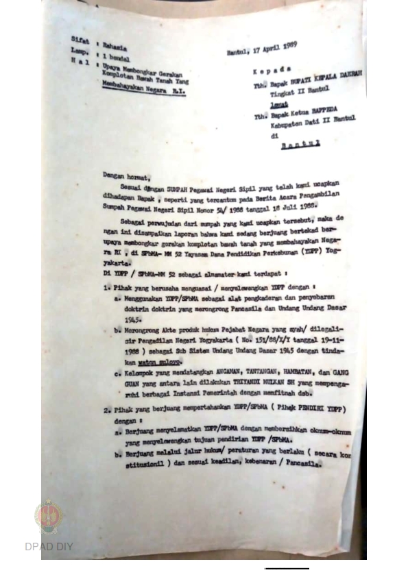 Surat rahasia dari Edy Mahmud Hidayat kepada Bupati Kepala Daerah TK II Bantul perihal upaya membongkar gerakan Komplotan Bawah Tanah yang membahayakan Negara RI di SPbMA-MM52 Yayasan Dana Pendidikan Perkebunan (YDPP) Yogyakarta.