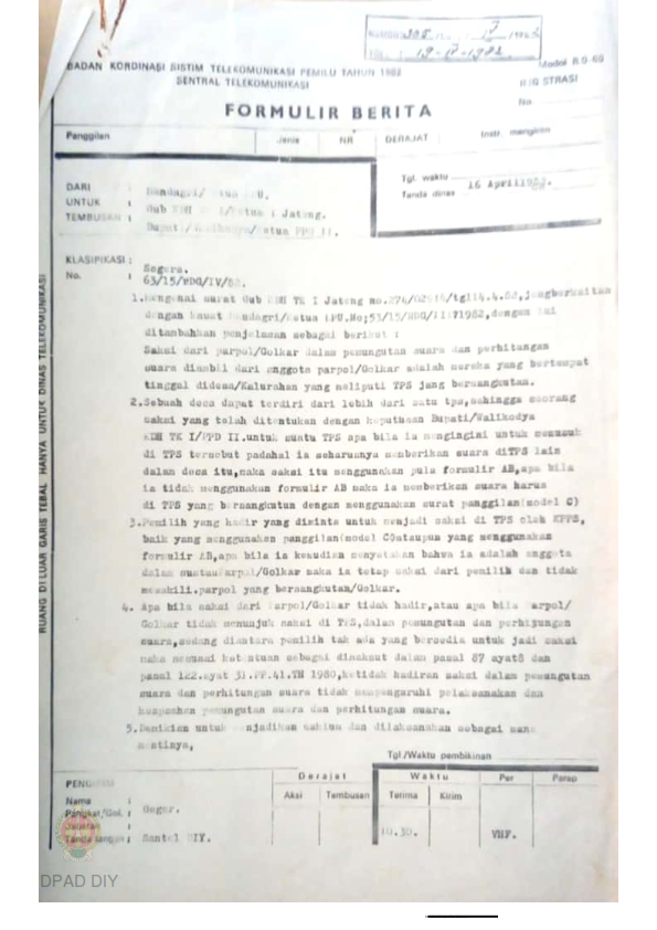 Surat telegram dari Menteri Dalam Negeri No.63/15/PDG/IV/82 kepada Gubernur KDH TK I Jateng tentang penjelasan saksi dari Parpol (Golkar dalam pemungutan suara dan penghitungan suara diambil dari Parpol/Golkar yang bertempat tinggal di desa / Kelurahan yang meliputi TPS yang bersangkutan.