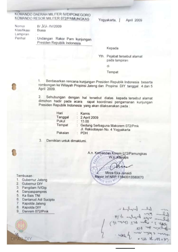 Undangan dari Komando Daerah Militer IV kepada Ketua Panwaslu Provinsi DIY perihal Rakor pengamanan kunjungan Presiden RI pada 2 April 2009 di Gedung Serbaguna Makorem