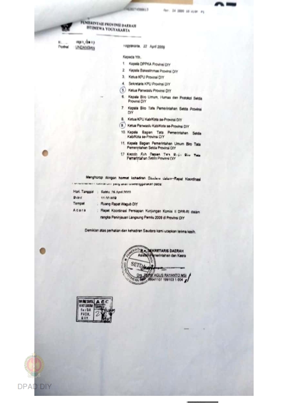 Undangan dari Pemda DIY kepada Ketua Panwaslu Provinsi DIY dan Kabupaten/Kota se-Provinsi DIY perihal Rapat Koordinasi persiapan kunjungan Komisi II DPR-RI dalam rangka peninjauan langsung Pemilu 2009 di Propinsi DIY pada 25 April 2009.