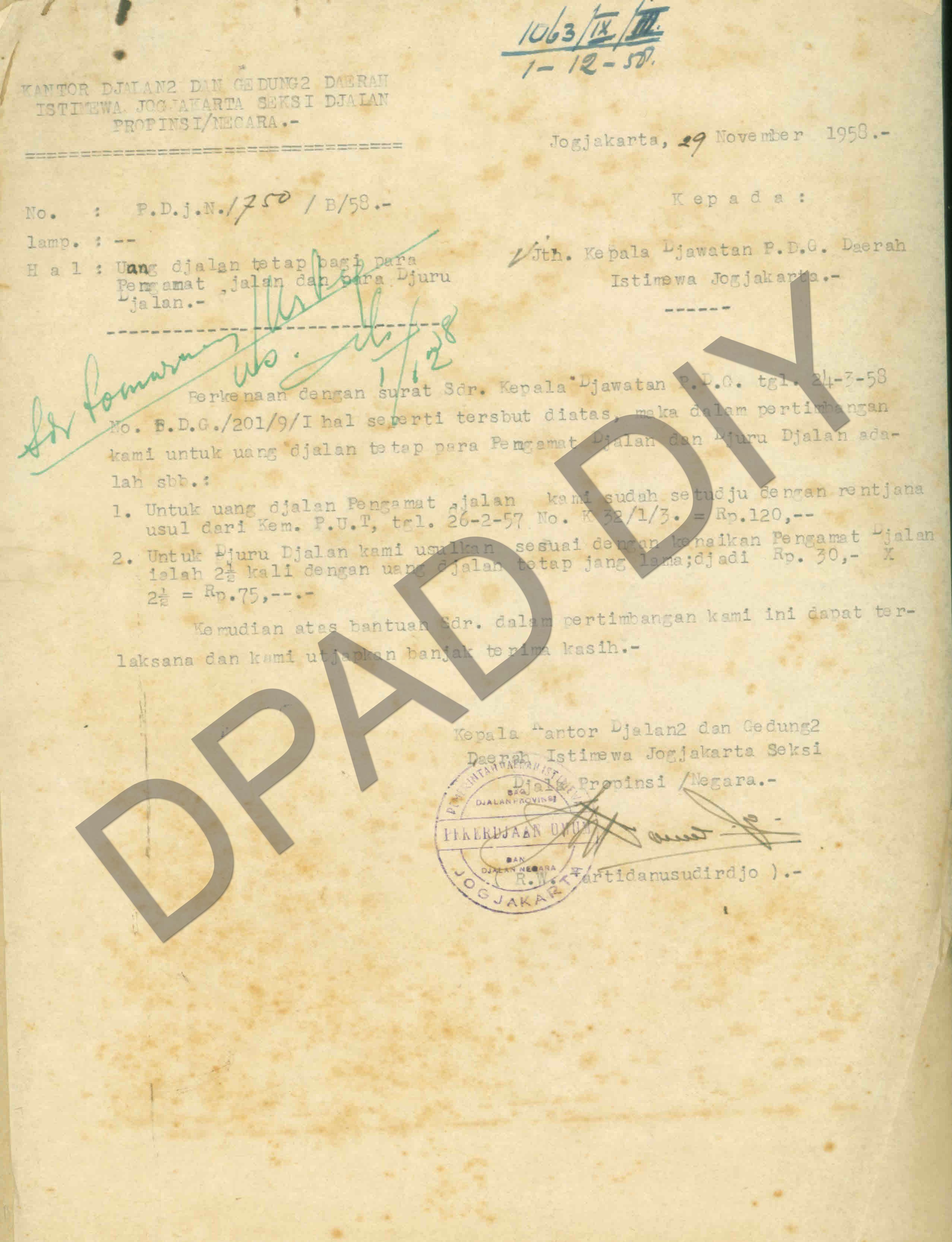 Item Bpad.Orba.T2.II.8.1.691 - Usulan tentang uang jalan tetap bagi Mantri Pengairan dan Mandor Jalan dari KPUT Jawatan Pengairan Jalan dan Gedung DIY